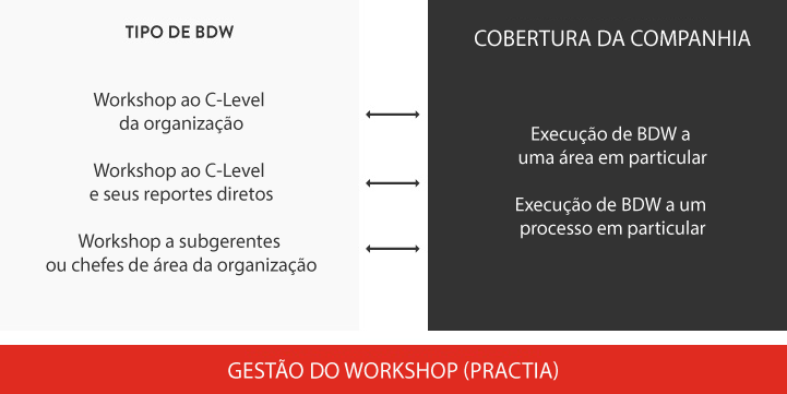 BDW C-Level + Subgerentes ou Chefes de Área: Este tipo de workshop busca vincular mais operativamente os problemas a serem automatizados no negócio com os da operação diária, permitindo entender melhor a área onde se deve focar.